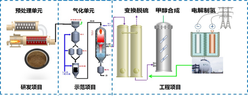 四、成果简介:本研究团队面向多种原料与操作工况,成功开发出低碳清洁高效气流床气化技术,具备广泛的原料适应性与高转化效率。该技术已在多个工业场景实现规模化应用,成效显著。与恒力石化(大连)炼化有限公司、华锦阿美石油化工有限公司合作,建成了目前全球日处理能力最大的水煤浆气化制氢装置,实现合成气原料的大规模稳定生产。与济南黄台煤气炉有限公司合作,在鞍山后英工业园区完成分级给氧气流床气化技术升级改造,通过精准供氧优化气化过程,高效制备高热值富甲烷燃气,满足菱镁等行业对燃气品质与温度均匀性的严苛需求。在阜新工业园区精细化工领域,该技术成功应用于高盐、高浓度有机废水处理,在实现废水清洁处理的同时联产合成气。此外,团队还开展了生物质气化技术研究,用于生产绿色甲醇与可持续航空燃料(SAF)等绿色燃料,积极助推低碳能源转型。