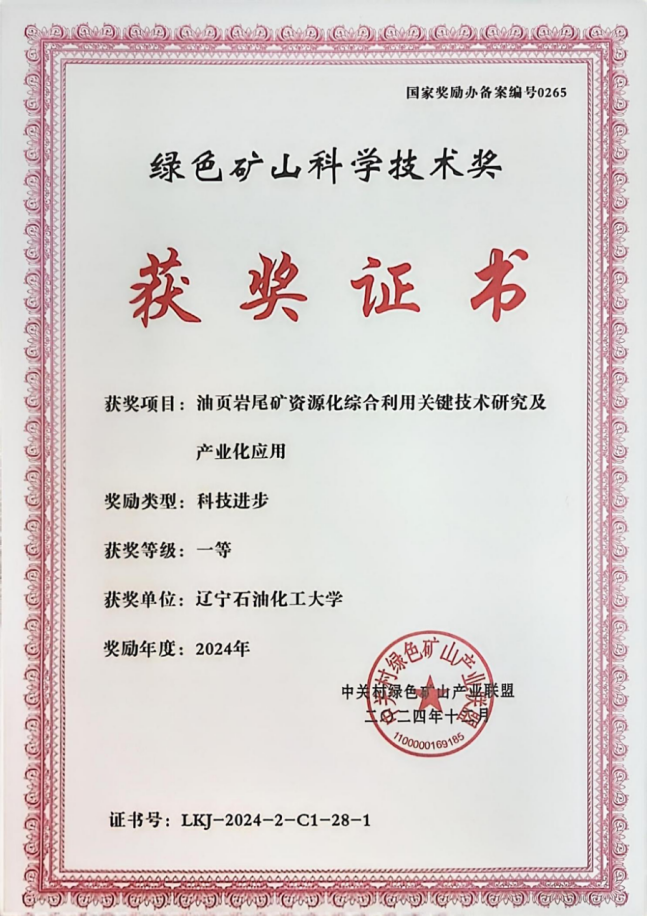 一、成果名称:油页岩尾矿资源化综合利用关键技术研究及产业化应用