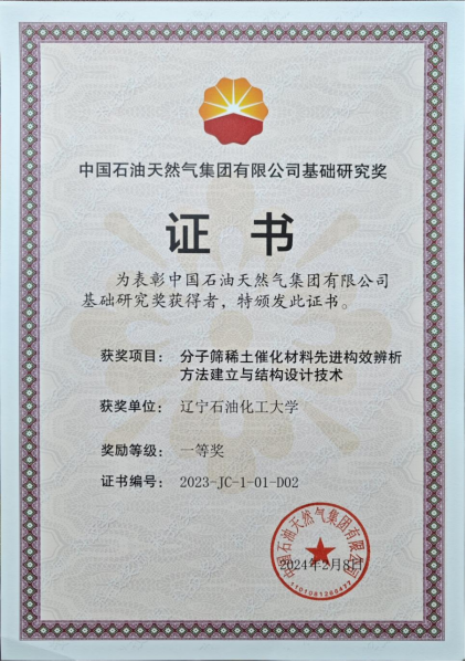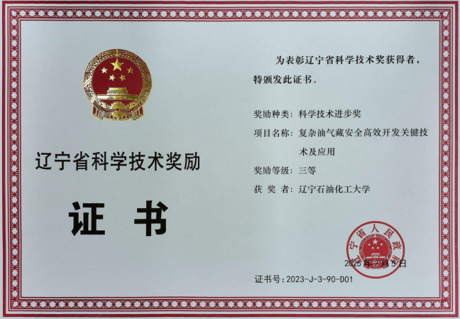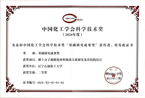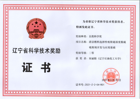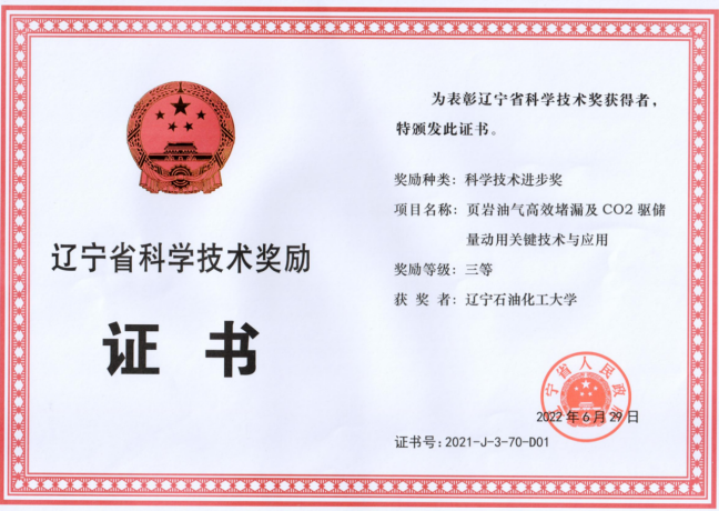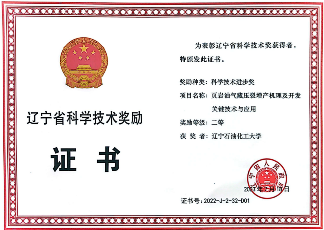 二、获奖及等级:辽宁省自然科学二等奖、中国天然气集团有限公司基础研究一等奖、中国化工学会科技二等奖。