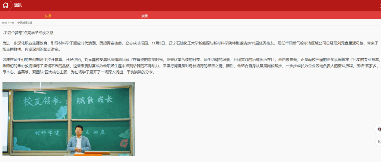 编者按:为进一步深化职业生涯教育,引导材料学子顺应时代浪潮、勇担青春使命、立志成才报国,11月10日,辽宁石油化工大学新能源与新材料学院特别邀请2013届优秀校友、现任华润燃气哈尔滨区域公司总经理刘元鑫重返母校,带来了一场主题鲜明、内涵深刻的励志讲座。中国都市报道网对此进行了宣传报道,现将相关报道转载如下: