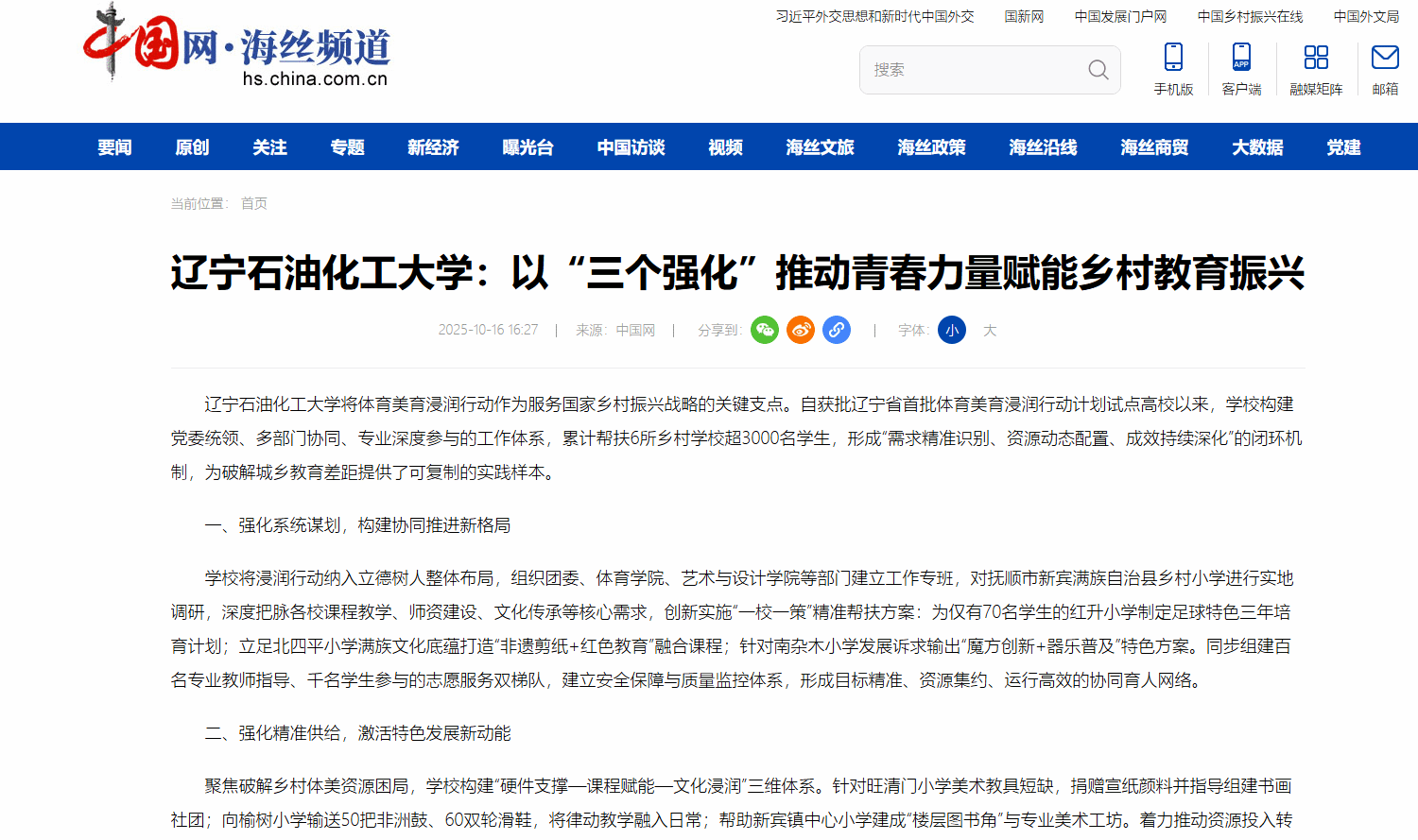 编者按:近日,中国网、中国经济新闻网、中国日报网对我校团委张国庆撰写的文章《辽宁石油化工大学:以“三个强化”推动青春力量赋能乡村教育振兴》进行了宣传报道。现将相关报道转载如下: