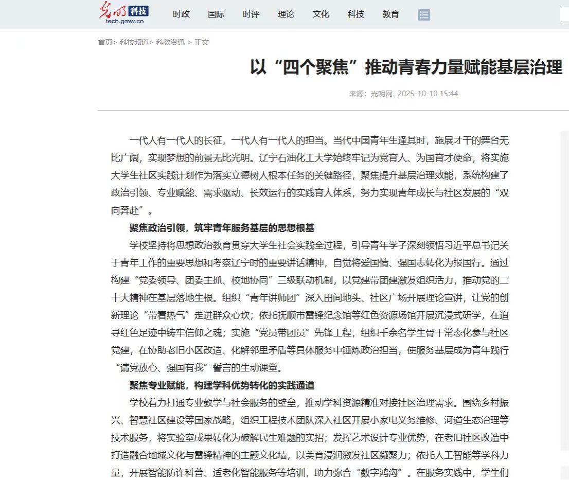编者按:近日,光明网、人民日报社民生周刊、党建网对我校团委张国庆撰写的文章《以“四个聚焦”推动青春力量赋能基层治理》进行了宣传报道。现将相关报道转载如下: