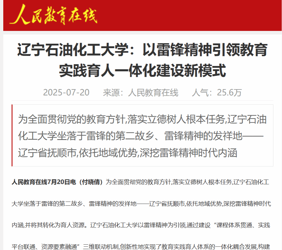 编者按:近日,人民教育在线(客户端)、中国晨报网、中国网、中国社区发展网、中华网等媒体平台对我校付晓倩老师撰写的理论文章《辽宁石油化工大学:以雷锋精神引领教育实践育人一体化建设新模式》进行了转载报道。现将相关报道转载如下: