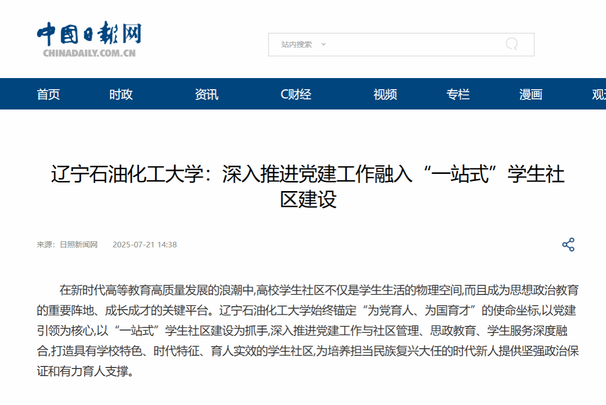 编者按:近日,中国日报网、中国工业新闻网(中国工业报官网)、中国网、中华网等媒体平台对我校付晓倩老师撰写的理论文章《辽宁石油化工大学:深入推进党建工作融入“一站式”学生社区建设》进行了转载报道。现将相关报道转载如下: