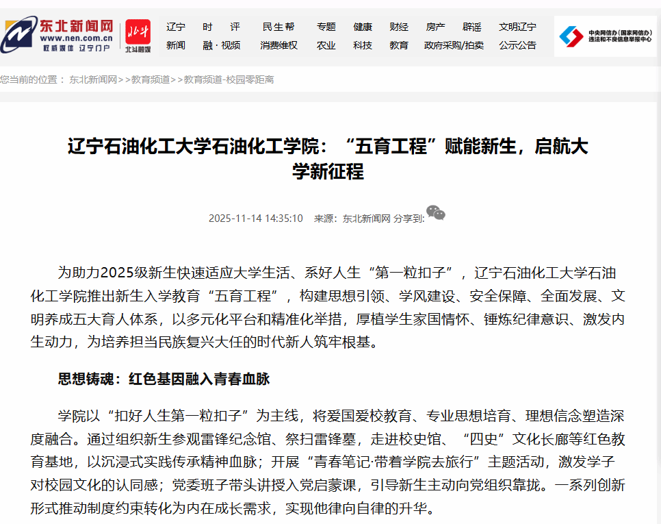 编者按:为助力2025级新生快速适应大学生活、系好人生“第一粒扣子”,辽宁石油化工大学石油化工学院推出新生入学教育“五育工程”,构建思想引领、学风建设、安全保障、全面发展、文明养成五大育人体系,以多元化平台和精准化举措,厚植学生家国情怀,锤炼纪律意识,激发成长内生动力。11月14日,东北新闻网对此工作进行了报道,现将相关报道转载如下: