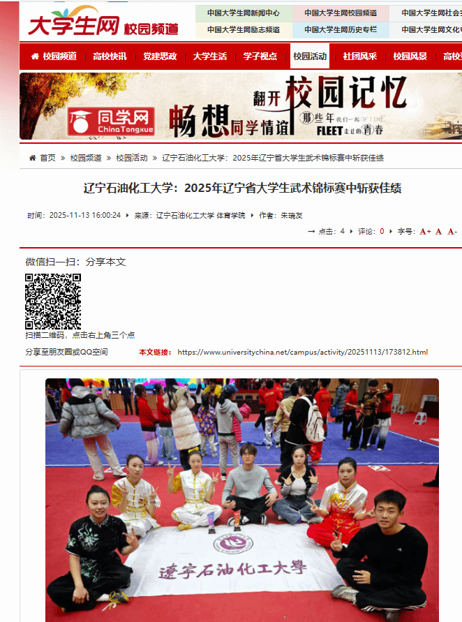 编者按:由辽宁省教育厅主办、沈阳理工大学承办的2025年辽宁省大学生武术锦标赛在沈阳理工大学文体中心举行。辽宁石油化工大学在比赛中发扬自强不息、崇德尚礼的武术精神,以毅力淬炼技艺与意志,共获得三项第一名、三项第二名、六项第三名。女子团体荣获体育院系乙组第二名,实现了我校该项目的历史性突破。中国大学生网对此进行了宣传报道,现将相关报道转载如下: