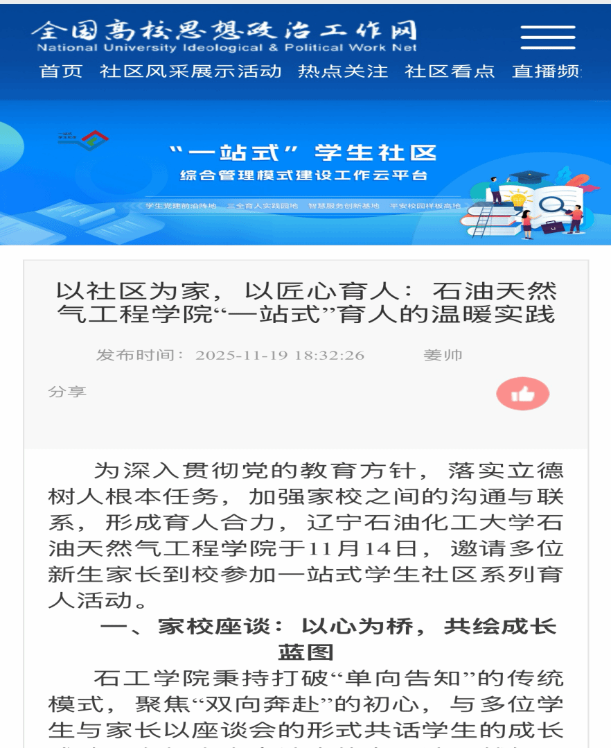编者按:为加强家校之间的沟通与联系,形成育人合力,辽宁石油化工大学石油天然气工程学院于11月14日,邀请多位新生家长到校参加一站式学生社区系列育人活动。全国高校思政工作网(一站式学生社区)对此进行了宣传。现将相关报道转载如下: