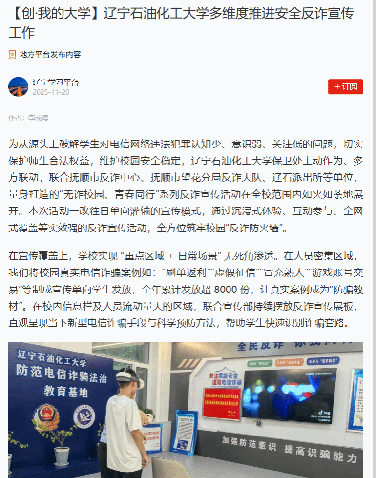编者按:为从源头上破解学生对电信网络违法犯罪认知少、意识弱、关注低的问题,切实保护师生合法权益,维护校园安全稳定,辽宁石油化工大学保卫处主动作为、多方联动,联合抚顺市反诈中心、抚顺市望花分局反诈大队、辽石派出所等单位,量身打造的“无诈校园、青春同行”系列反诈宣传活动在全校范围内如火如荼地展开。本次活动一改往日单向灌输的宣传模式,通过沉浸式体验、互动参与、全网式覆盖等实效强的反诈宣传活动,全方位筑牢校园“反诈防火墙”。学习强国辽宁学习平台、人民日报客户端·人民号、辽宁日报·辽望号、中国大学生网、搜狐号等媒体关注报道,引发广泛反响。现将相关报道转载如下: