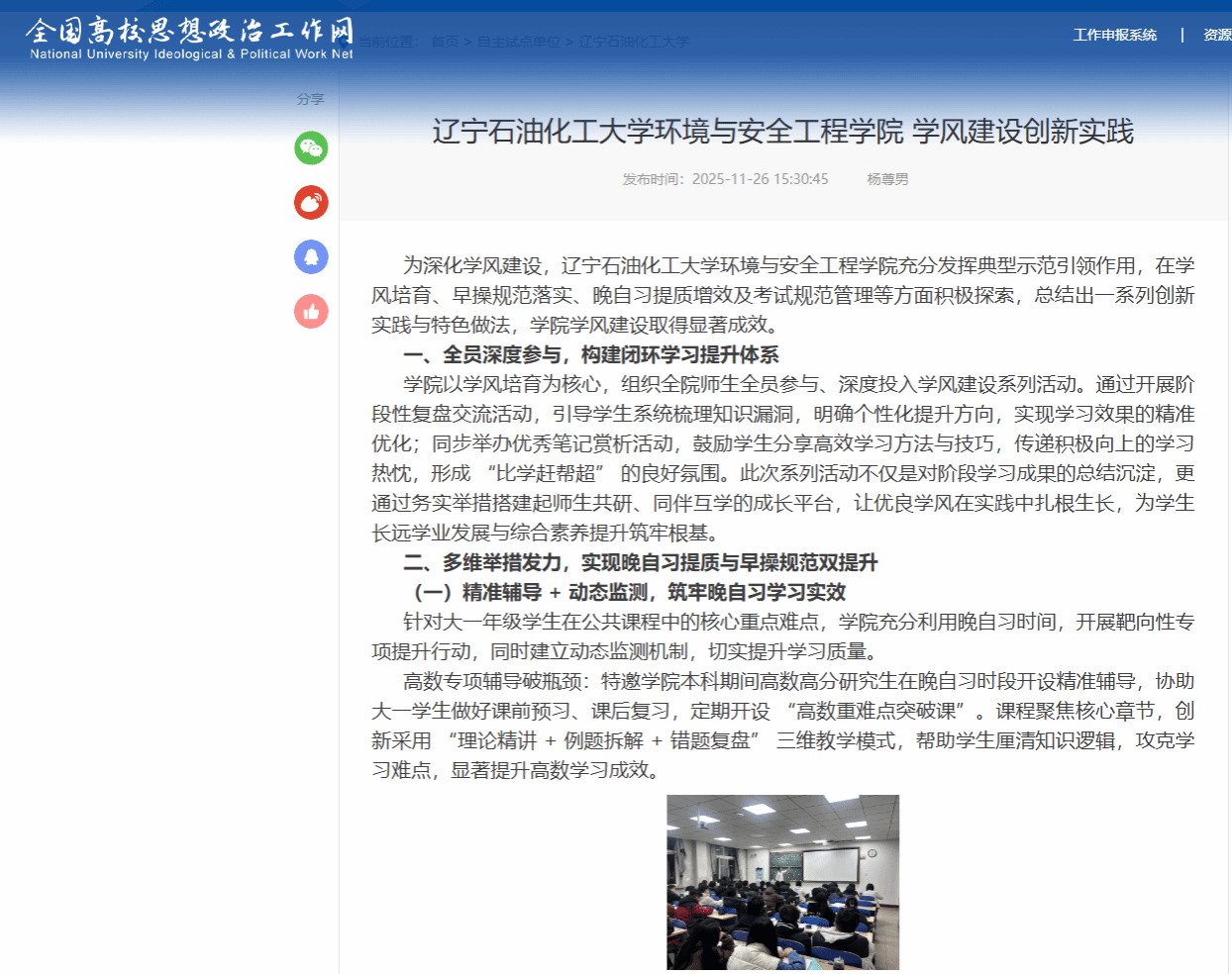 编者按:为深化学风建设,辽宁石油化工大学环境与安全工程学院充分发挥典型示范引领作用,在学风培育、早操规范落实、晚自习提质增效及考试规范管理等方面积极探索,总结出一系列创新实践与特色做法,学院学风建设取得显著成效。全国高校思想政治工作网(“一站式”学生社区)对此进行了宣传报道。现将相关报道转载如下: