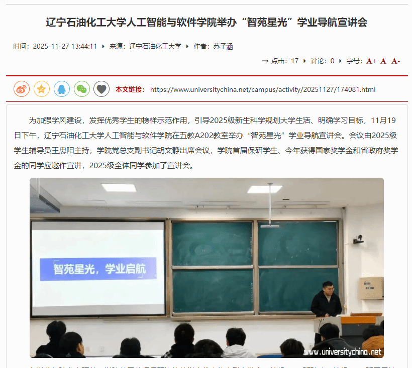 编者按:11月19日,辽宁石油化工大学人工智能与软件学院以“榜样领航育学风”为核心,在五教A202教室举办“智苑星光”学业导航宣讲会。活动搭建了高低年级交流互鉴平台,助力学风建设深化与新生成长规划落地,中国大学生网对此进行了宣传报道,现将相关报道转载如下: