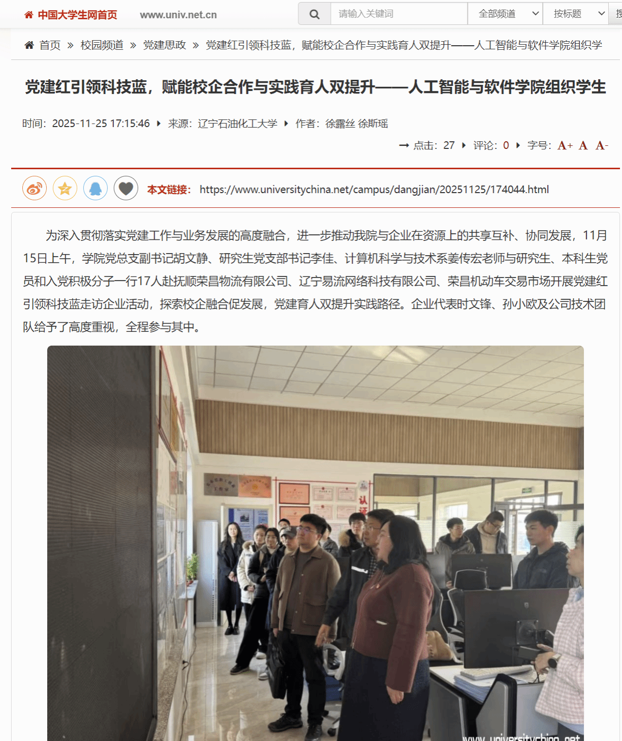 编者按:11月15日,辽宁石油化工大学人工智能与软件学院以 “党建红引领科技蓝” 为核心,组织师生赴抚顺荣昌物流有限公司、辽宁易流网络科技有限公司、荣昌机动车交易市场开展企业走访交流活动。中国大学生网对此进行了宣传报道。现将相关报道转载如下: