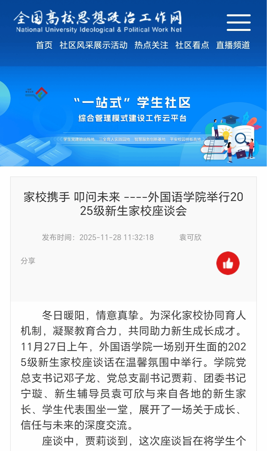 编者按:为深化家校协同育人机制,凝聚教育合力,共同助力新生成长成才。11月27日上午,辽宁石油化工大学外国语学院一场别开生面的2025级新生家校座谈会在温馨氛围中举行。全国高校思想政治工作网(“一站式”学生社区)、中国大学生网对其内容进行了宣传报道,现将相关报道转载如下: