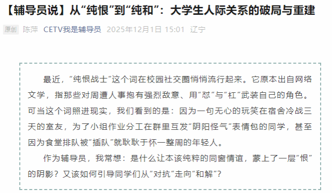 编者按:近日,“CETV我是辅导员”微信公众号对我校陈萍老师撰写的文章《从“纯恨”到“纯和”:大学生人际关系的破局与重建》进行了转载报道。现将相关报道转载如下: