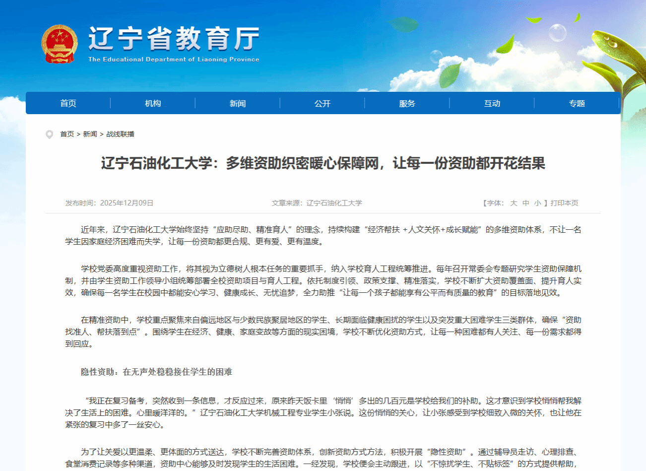 编者按:近年来,辽宁石油化工大学坚守“应助尽助、精准育人”的初心,构建“经济帮扶 +人文关怀+成长赋能”的多维资助体系。通过隐性资助、返乡补助、临时困难补助等暖心举措,为家庭经济困难学生筑牢求学保障线,将资助工作融入立德树人全过程,不断提升资助工作的温度与实效。相关成效受到社会关注与肯定,辽宁省教育厅官网对此进行了宣传报道。现将相关报道转载如下: