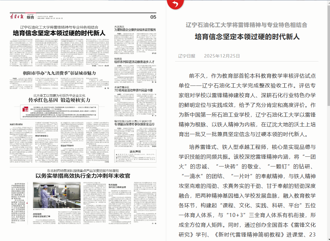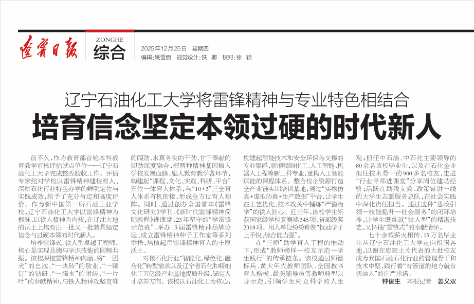 编者按:12月25日,《辽宁日报》刊发题为《辽宁石油化工大学将雷锋精神与专业特色相结合 培育信念坚定本领过硬的时代新人》的深度报道,全面展现了我校作为新中国第一所石油工业学校,70余载以雷锋精神为根脉、以铁人精神为内核,深挖两种精神的时代内涵并深度融合,构建“课程、文化、实践、科研、平台”五位一体育人体系,精准对接石油石化行业“智能化、绿色化、融合化”转型趋势及辽宁省万亿级产业基地建设需求,在品德培育与技能锤炼的同频共振中,持续培育雷锋式、铁人型卓越工程师的特色育人成效。现将报道转载如下: