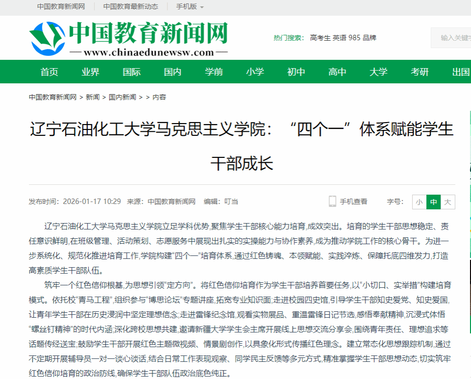 编者按:近日,中国教育新闻网、中国日报网、改革网、中华网等媒体平台对我校马克思主义学院教师撰写的理论文章《辽宁石油化工大学马克思主义学院:“四个一”体系赋能学生干部成长》进行了转载报道。现将相关报道转载如下: