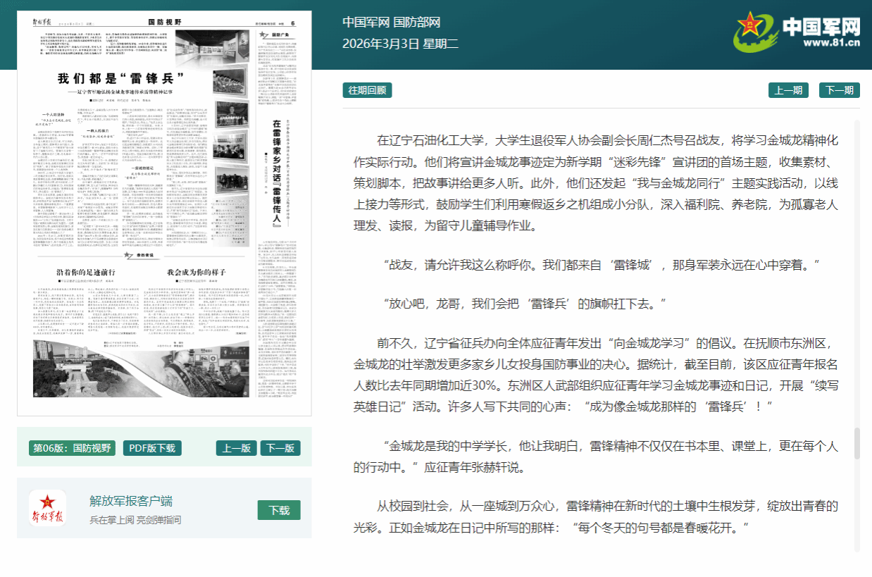 编者按:3月3日,《解放军报》纸媒第6版、《中国国防报》纸媒第3版,国防部网站、中国军网、央广网等刊发《我们都是“雷锋兵”——辽宁省军地弘扬金城龙事迹传承雷锋精神记事》,对我校大学生退役军人协会学习金城龙精神进行了报道,现将相关报道转载如下: