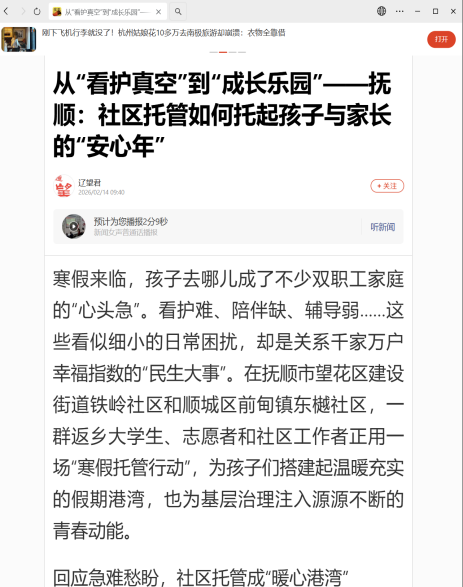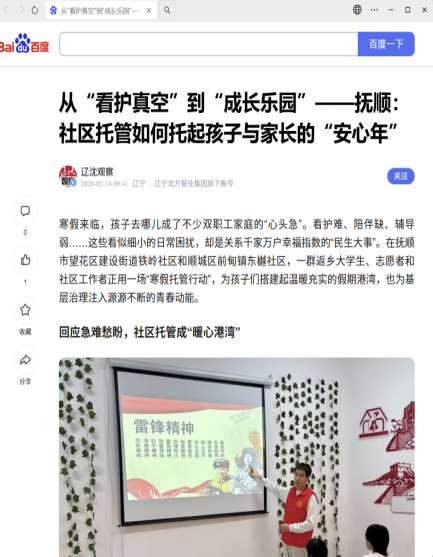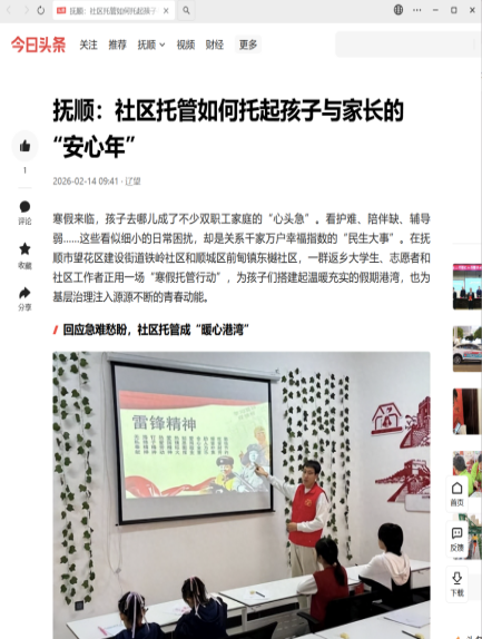 编者按:寒假来临,孩子去哪儿成了不少双职工家庭的“心头急”。看护难、陪伴缺、辅导弱……这些看似细小的日常困扰,却是关系千家万户幸福指数的“民生大事”。在抚顺市望花区建设街道铁岭社区和顺城区前甸镇东樾社区,一群返乡大学生、志愿者和社区工作者正用一场“寒假托管行动”,为孩子们搭建起温暖充实的假期港湾,也为基层治理注入源源不断的青春动能。搜狐新闻、辽望号、辽沈观察对此进行了宣传报道。现将相关报道转载如下: