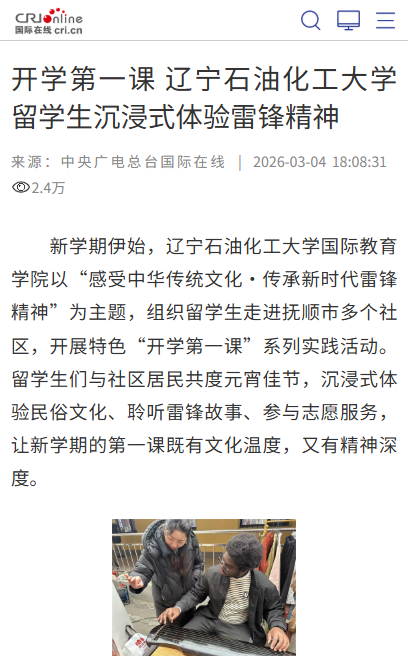 编者按:近日,中央广电总台国际在线对我校国际教育学院以 “感受中华传统文化・传承新时代雷锋精神” 为主题,组织留学生走进抚顺市多个社区开展特色 “开学第一课” 系列实践活动进行了宣传报道。现将相关报道转载如下: