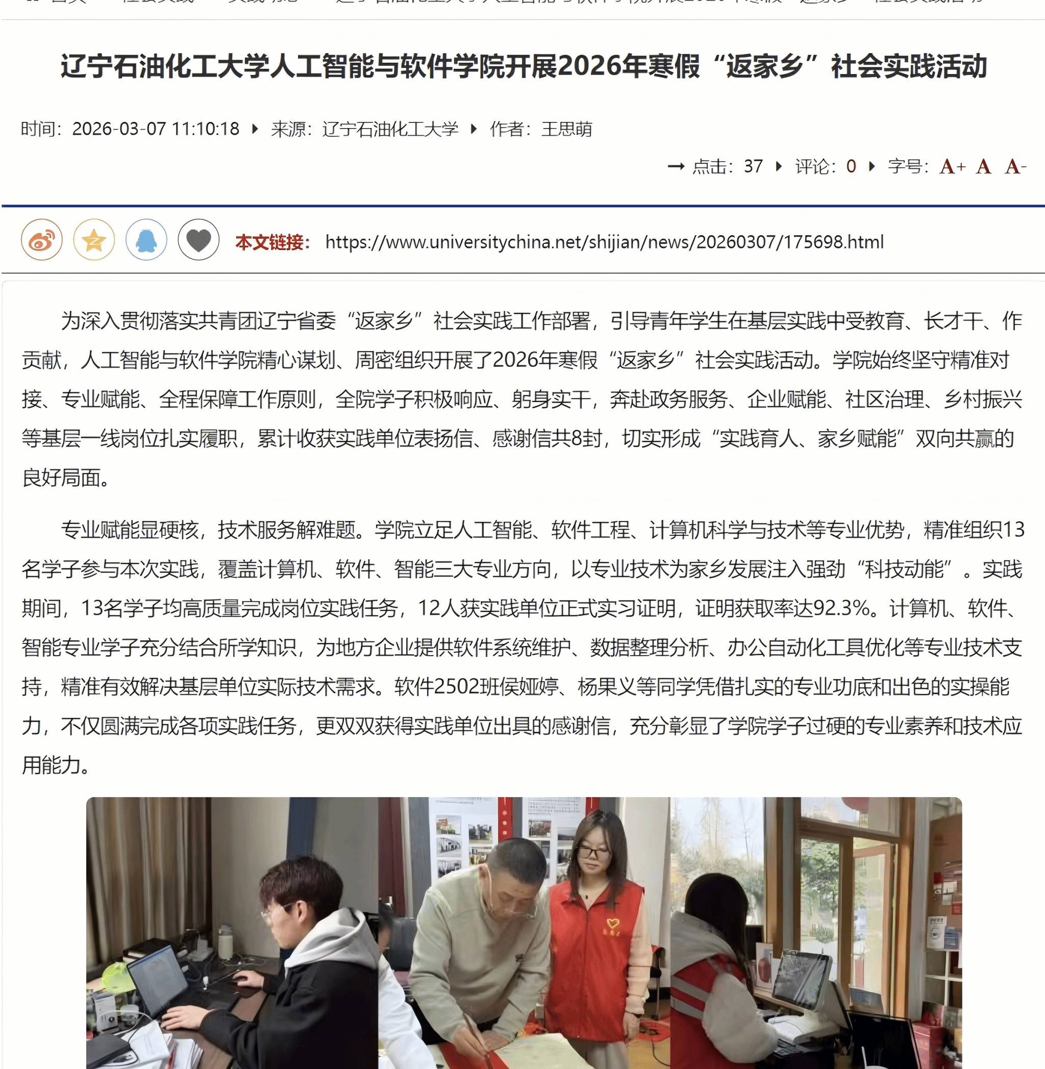 编者按:2026年寒假,辽宁石油化工大学人工智能与软件学院扎实开展“返家乡”社会实践活动,以实践育人、专业赋能为核心,精准对接基层发展需求,组织学子奔赴基层一线履职实干,搭建专业服务家乡、青春赋能发展的实践平台,引导青年学子在实践中长才干、作贡献。中国大学生网对此进行了宣传报道,现将相关报道转载如下: