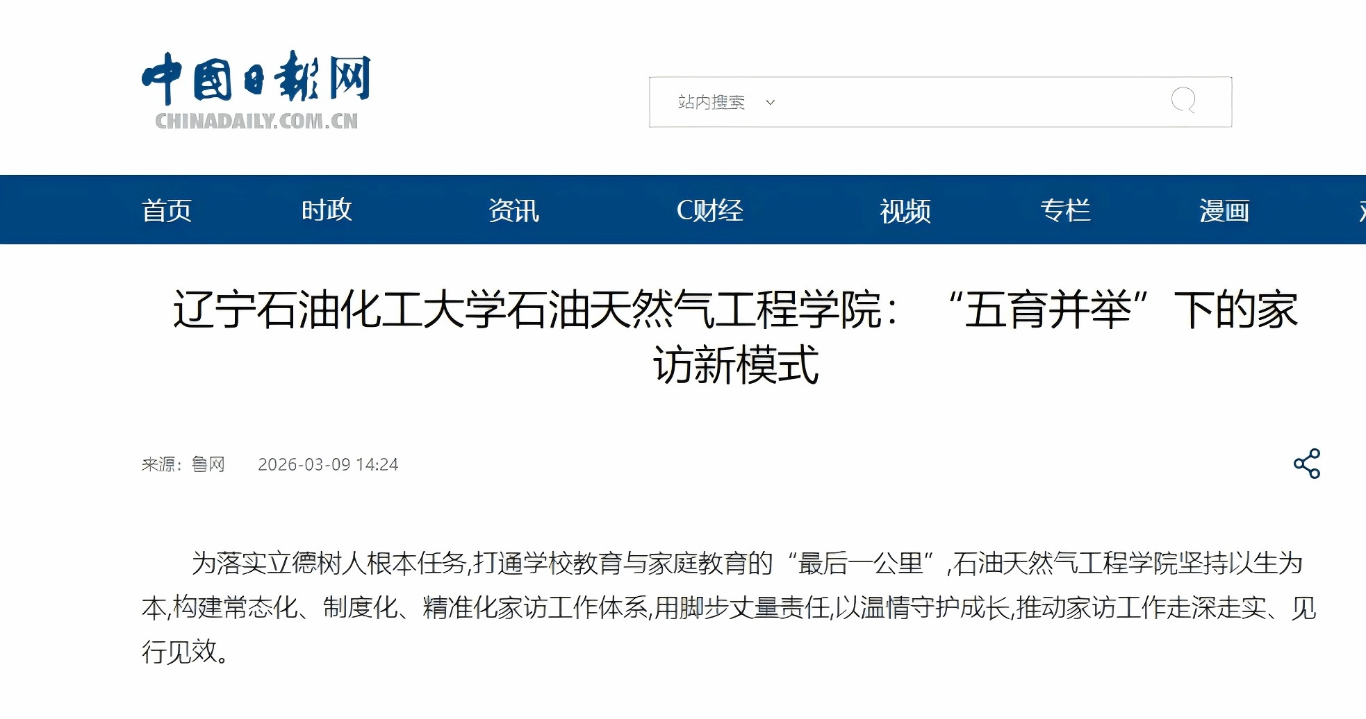 编者按:近日,中国日报网、中华网、中国网、改革网等媒体平台对我校石油天然气工程学院教师撰写的理论文章《辽宁石油化工大学石油天然气工程学院:“五育并举”下的家访新模式》进行了转载报道。现将相关报道转载如下: