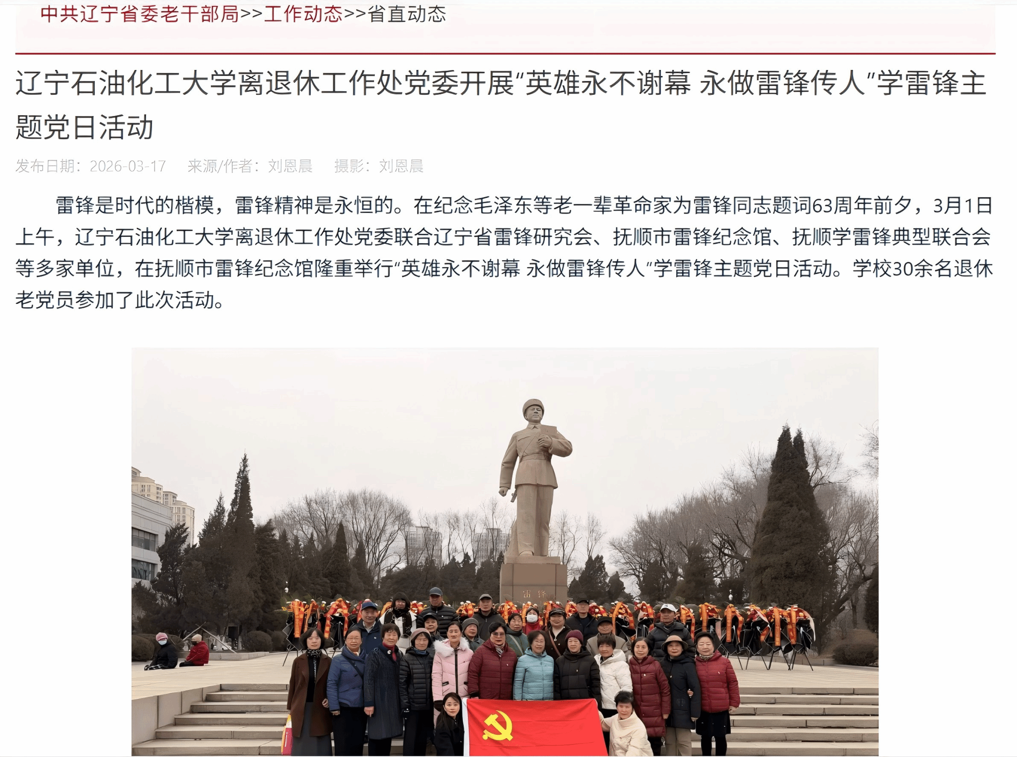 编者按:近日,中共辽宁省委老干部局官网登载了我校离退休工作处撰写的文章《离退休工作处党委开展“英雄永不谢幕 永做雷锋传人”学雷锋主题党日活动》。现将相关报道转载如下: