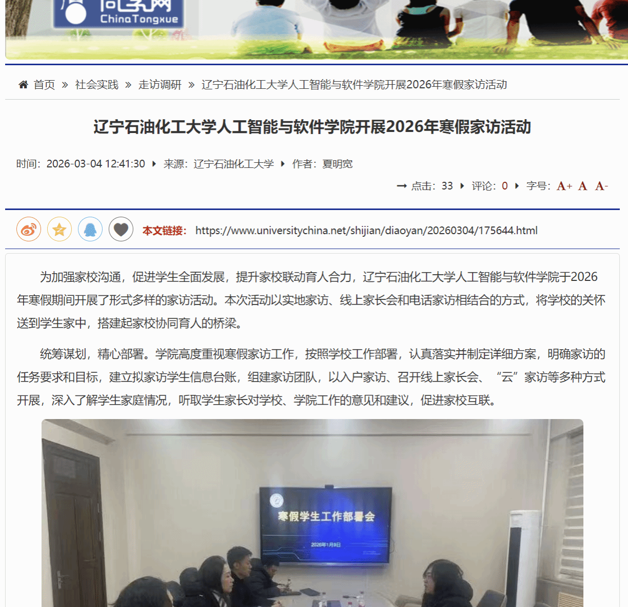 编者按:2026年寒假,辽宁石油化工大学人工智能与软件学院开展“家校携手同心筑梦”主题家访活动,以精准关爱学生为核心,创新线上线下结合的家访模式,搭建家校协同育人坚实桥梁,助力学生成长成才。中国大学生网对此进行了宣传报道,现将相关报道转载如下: