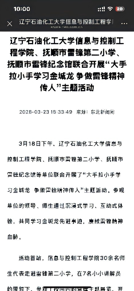 编者按:近日,东北新闻网、全国高校思想政治工作网等媒体平台对我校徐林老师撰写的“辽宁石油化工大学信息与控制工程学院、抚顺市雷锋第二小学、抚顺市雷锋纪念馆联合开展‘大手拉小手 学习金城龙 争做雷锋精神传人’主题活动”的文章进行了转载报道。现将相关报道转载如下: