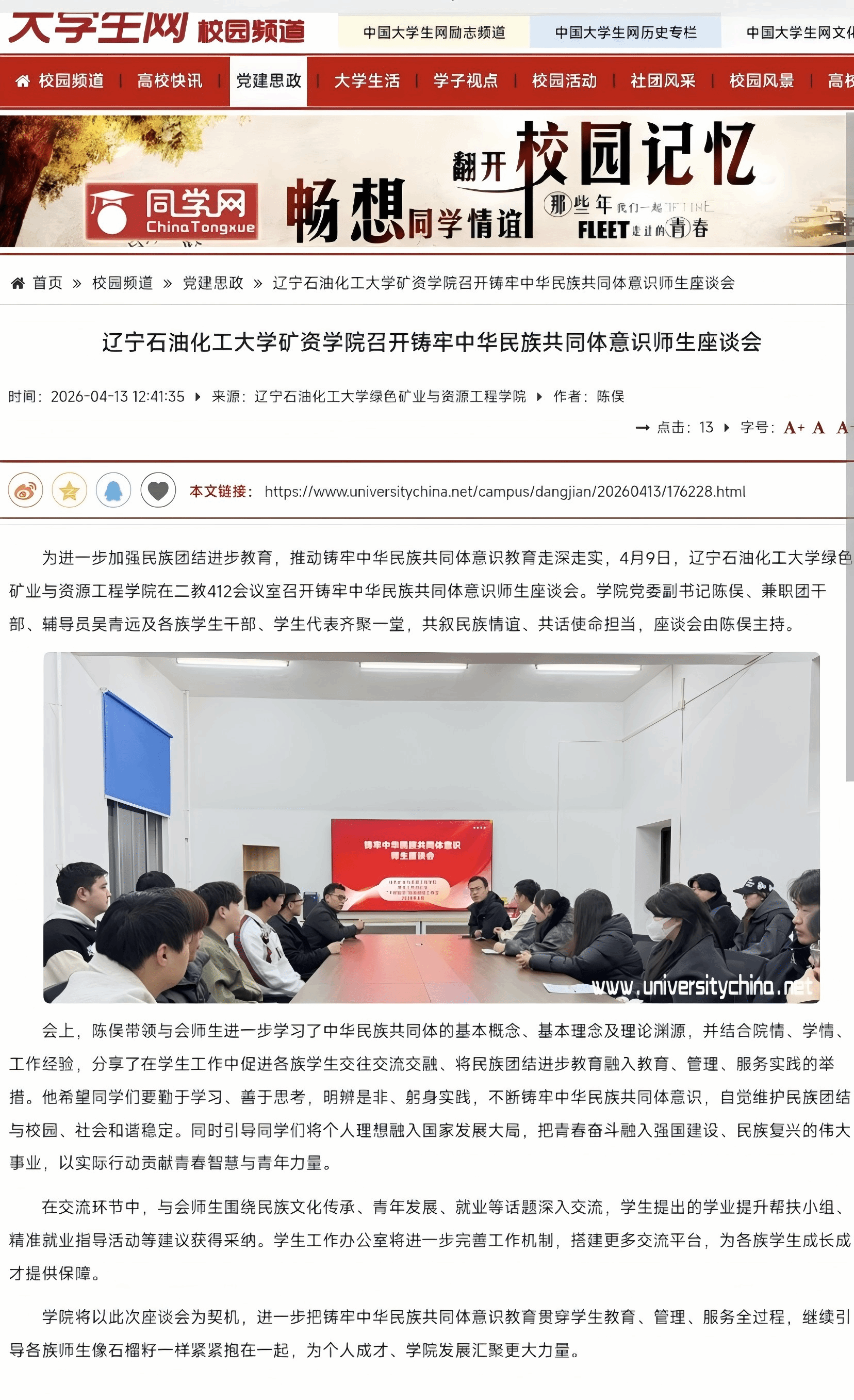 编者按:为进一步加强民族团结进步教育,推动铸牢中华民族共同体意识教育走深走实,4月9日,辽宁石油化工大学绿色矿业与资源工程学院在二教412会议室召开铸牢中华民族共同体意识师生座谈会。中国大学生网对此进行了报道,现将相关报道转载如下:
