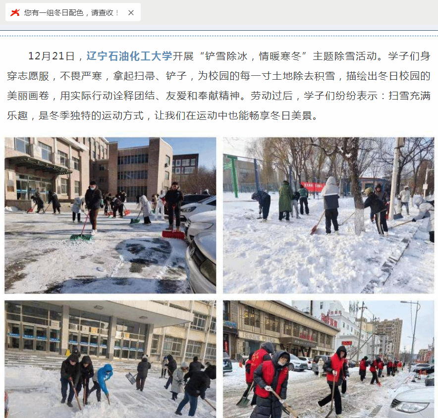 编者按:近日,教育部中国大学生在线微信公众号发文《您有一组冬日配色,请查收!》,对高校学子们在银装素裹下,与雪为伴、肆意创造,定格短暂美好,赋予冬日暖意做了宣传,其中,对我校师生开展“铲雪除冰,情暖寒冬”主题除雪活动进行了宣传报道。现将相关报道转载如下: