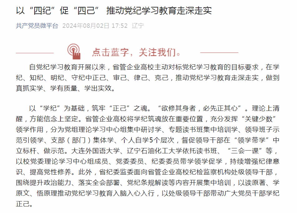 编者按:8日2日,共产党员微平台微信公众号以《以“四纪”促“四己” 推动党纪学习教育走深走实》为题,对省管企业高校主动对标党纪学习教育的目标要求,在学纪、知纪、明纪、守纪中正己、审己、律己、克己,推动党纪学习教育走深走实,做到真抓实学、学有质量、学出实效进行了宣传,其中对我校依托读书班、“三会一课”等,以校党委理论学习中心组成员、党委委员、纪委委员带学领学促学,持续增强纪律意识、提高党性修养作了报道。现将相关报道转载如下: