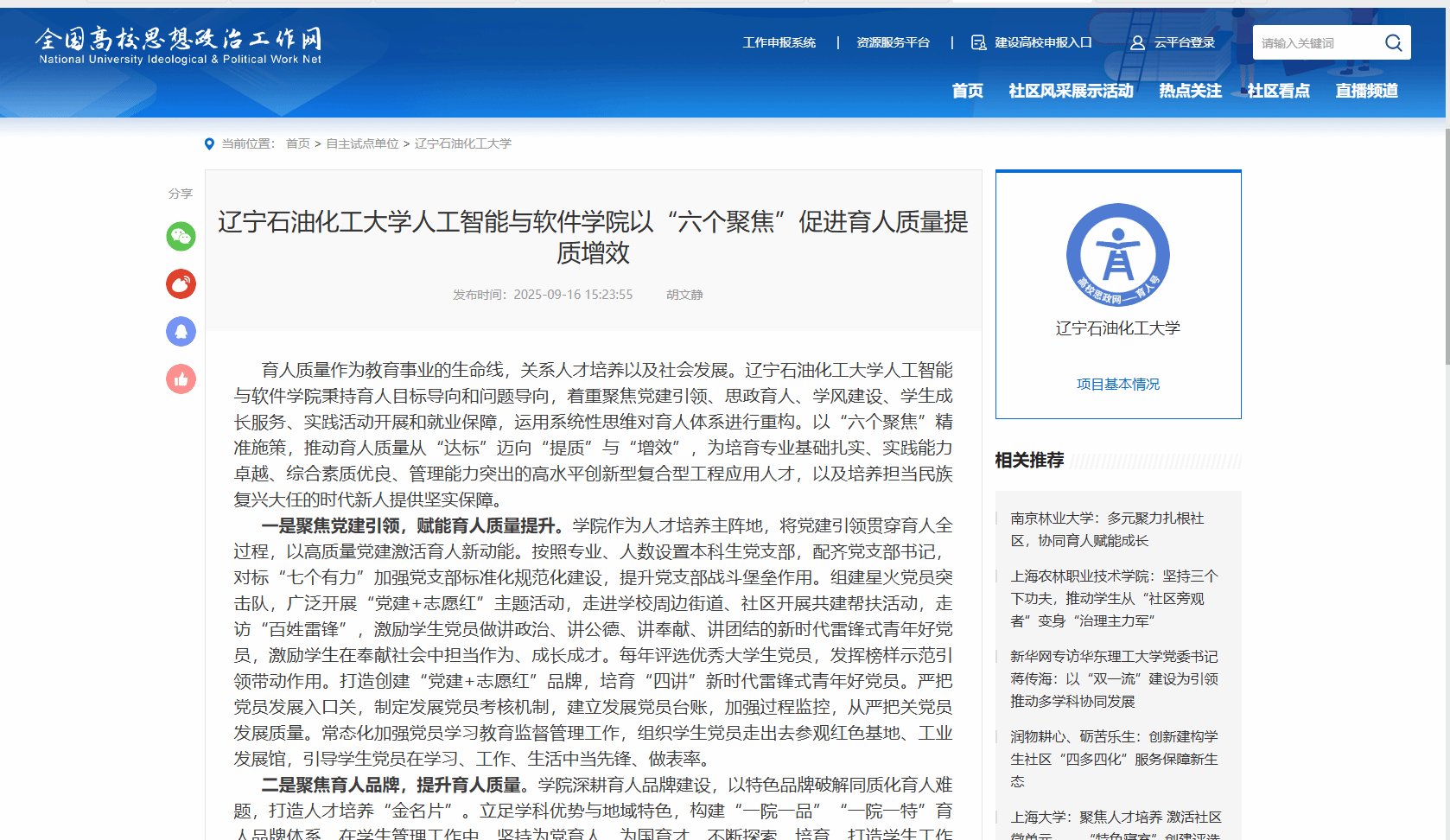 编者按:近日,全国高校思想政治工作网一站式学生社区、中国大学生网等媒体平台对我校人工智能与软件学院胡文静老师撰写的文章《辽宁石油化工大学人工智能与软件学院以“六个聚焦”促进育人质量提质增效》进行了宣传报道,现将相关报道转载如下: