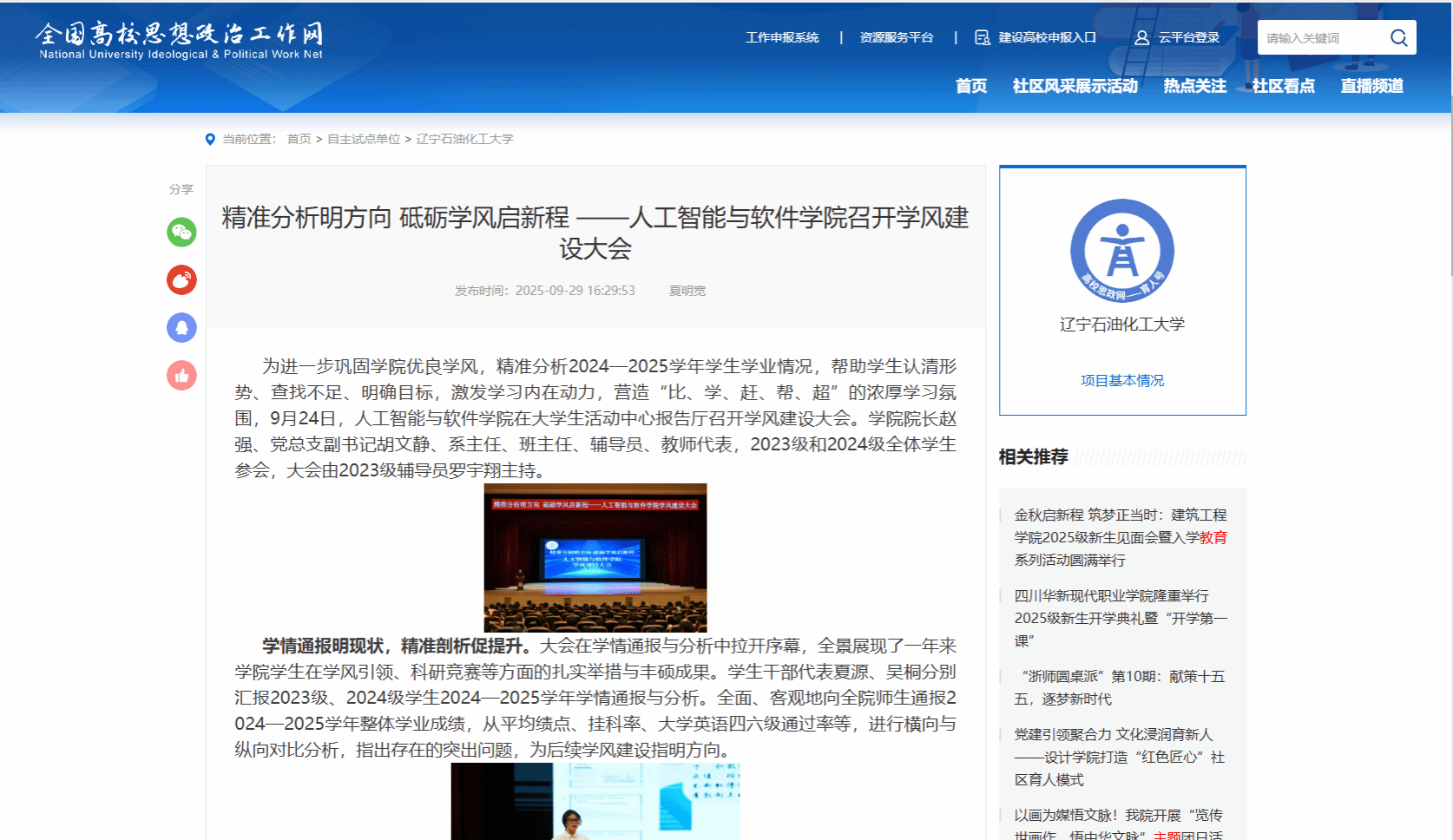 编者按:近日,为进一步巩固学院优良学风,精准分析2024—2025学年学生学业情况,帮助学生认清形势、查找不足、明确目标,激发学习内在动力,营造“比、学、赶、帮、超”的浓厚学习氛围,9月24日,人工智能与软件学院在大学生活动中心报告厅召开学风建设大会。全国高校思想政治工作网一站式学生社区对此进行了宣传报道,现将相关报道转载如下:
