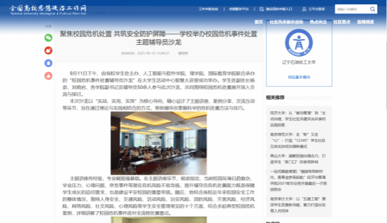 编者按:9月11日下午,由我校学生处主办,人工智能与软件学院、理学院、国际教育学院联合承办的“校园危机事件处置辅导员沙龙”在大学生活动中心智慧大讲堂成功举办。全国高校思想政治工作网一站式学生社区对此进行了宣传报道,现将相关报道转载如下: