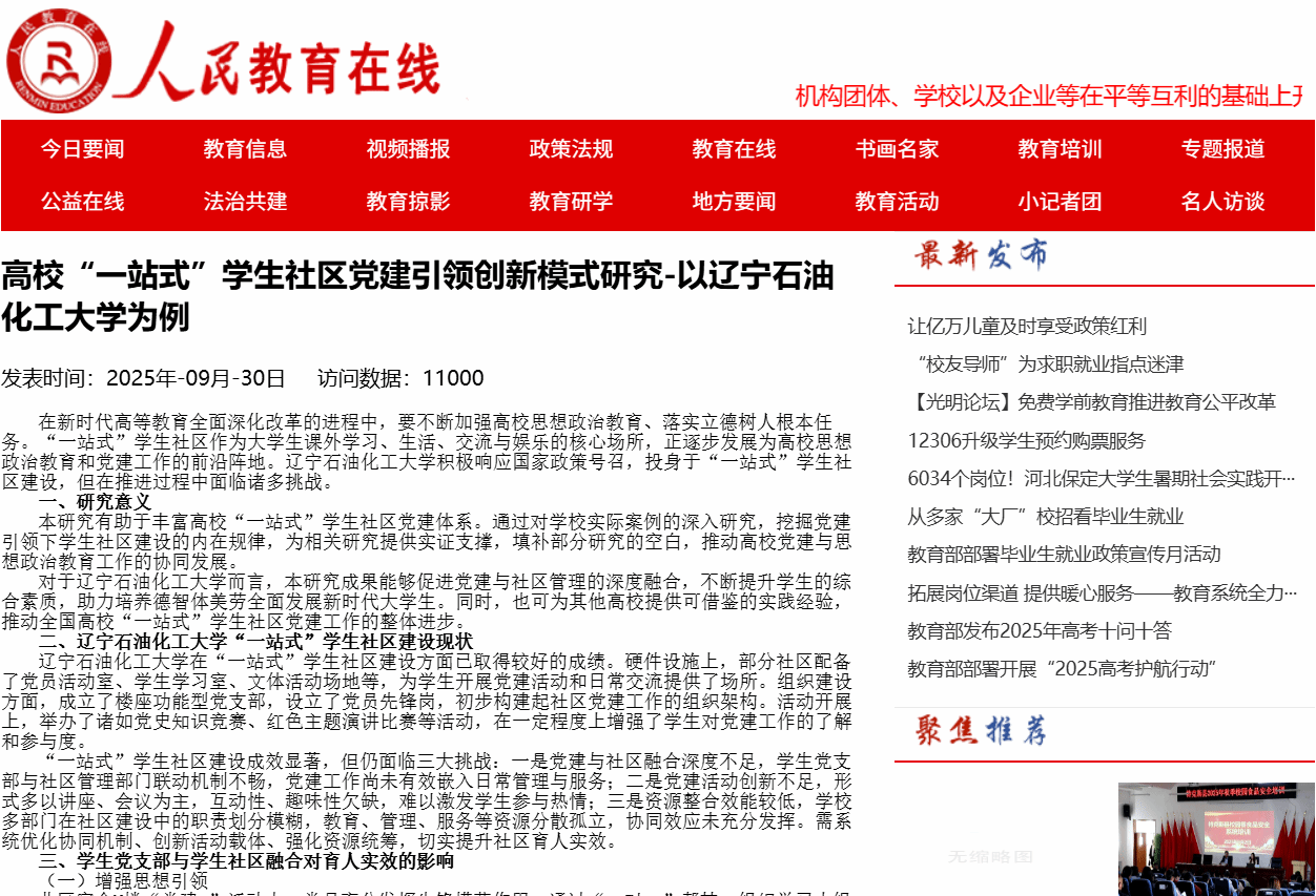 编者按:近日,人民教育在线、中华网、中国网、中国大学生网等媒体平台对我校外国语学院袁可欣老师撰写的文章《高校“一站式”学生社区党建引领创新模式研究一一以辽宁石油化工大学为例》进行了宣传报道。现将相关报道转载如下: