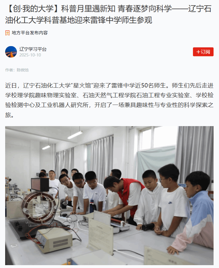 编者按:近日,辽宁石油化工大学“星火馆”迎来了雷锋中学近50名师生。师生们先后走进学校理学院趣味物理实验室、石油天然气工程学院石油工程专业实验室、学校检验检测中心及工业机器人研究所,开启了一场兼具趣味性与专业性的科学探索之旅。学习强国辽宁学习平台对此进行了宣传报道。现将相关报道转载如下: