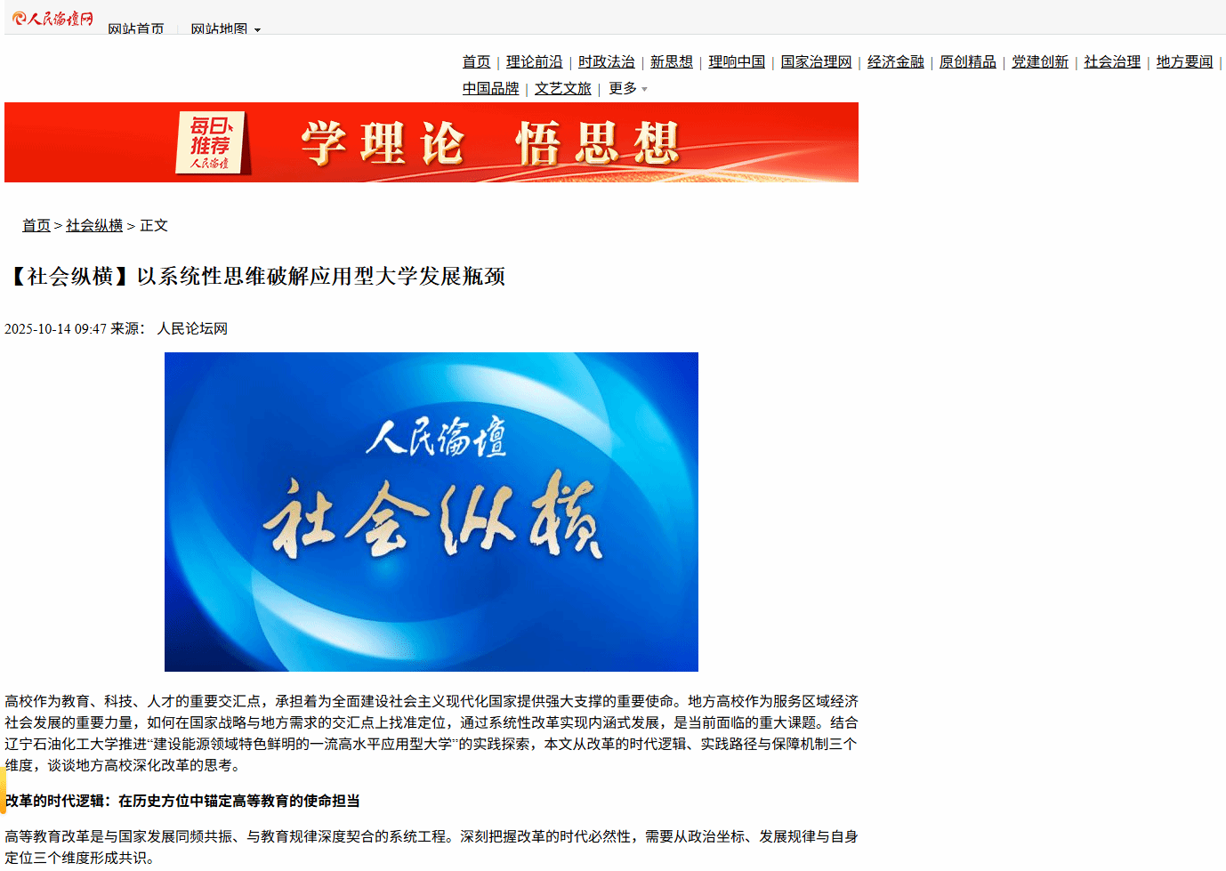 编者按:近日,人民论坛网对我校发展规划处处长李焱斌撰写的文章《以系统性思维破解应用型大学发展瓶颈》进行了刊发宣传。该文结合辽宁石油化工大学推进“建设能源领域特色鲜明的一流高水平应用型大学”的实践探索,从改革的时代逻辑、实践路径与保障机制三个维度,谈了地方高校深化改革的思考。现将相关报道转载如下: