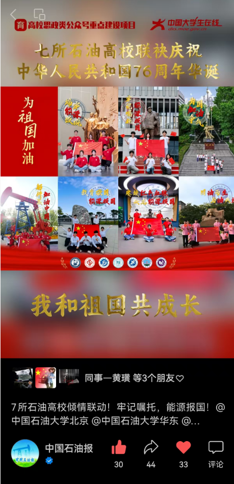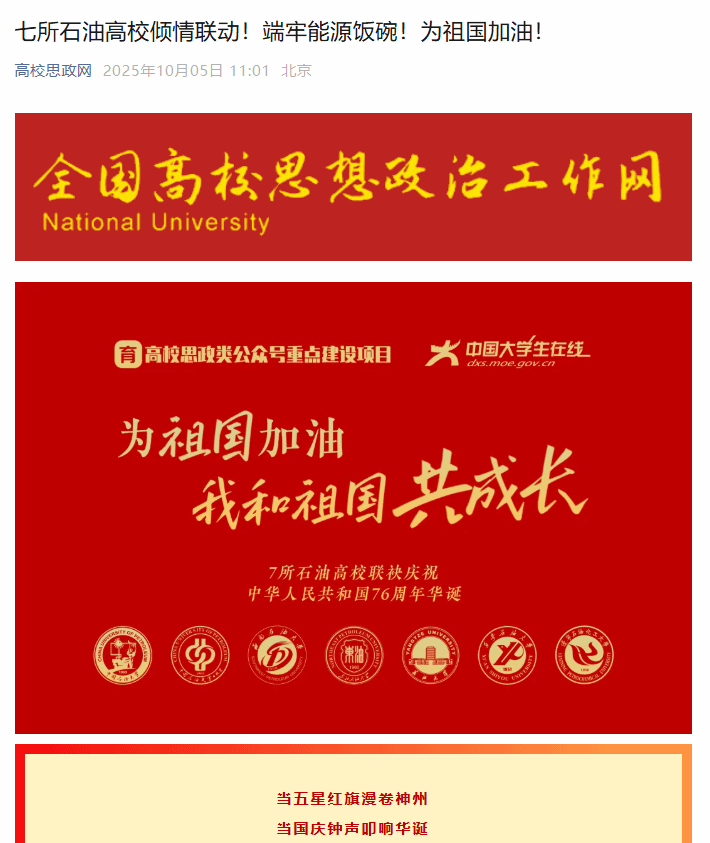 编者按:当五星红旗漫卷神州,当国庆钟声叩响华诞。在新中国成立76周年之际,中国石油大学(华东)、中国石油大学(北京)、西南石油大学、东北石油大学、长江大学、西安石油大学、辽宁石油化工大学七所扎根能源沃土的石油高校携手而立,联袂庆祝中华人民共和国76周年华诞,以石油人的赤诚与担当共同告白祖国!为祖国加油,和祖国共成长!高校思政网,中国大学生在线微信公众号、视频号、官方微博,中国石油报,半岛网,石油Link,钻采之声,学习强国等媒体平台对此进行了宣传报道。现将相关报道转载如下: