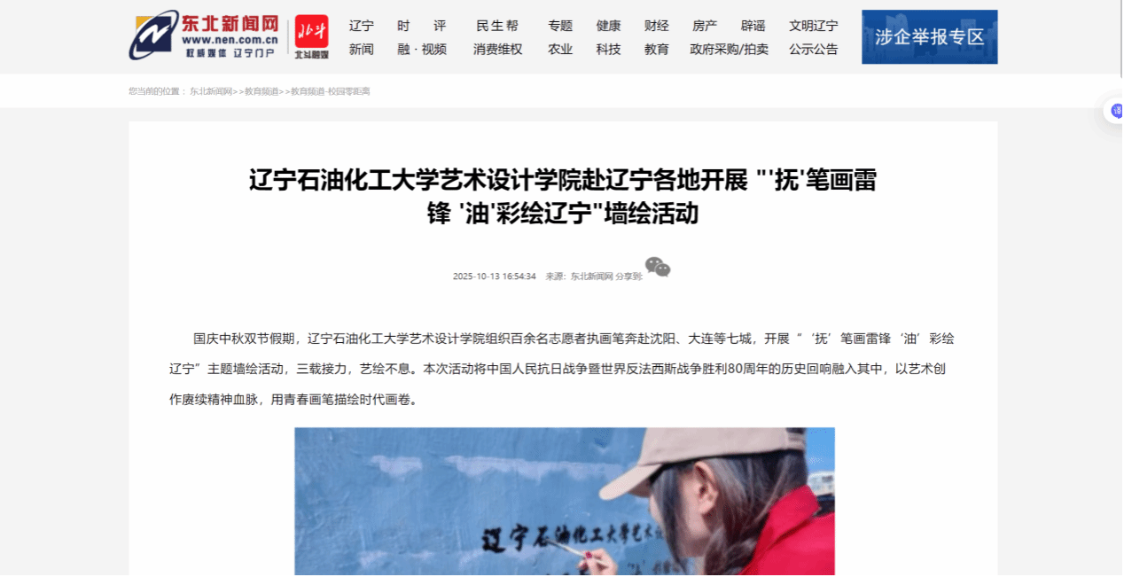 编者按:国庆中秋双节假期,辽宁石油化工大学艺术设计学院组织百余名志愿者执画笔奔赴沈阳、大连等七城,开展“‘抚’笔画雷锋 ‘油’彩绘辽宁”主题墙绘活动。以艺术创作赓续精神血脉,用青春画笔描绘时代画卷。东北新闻网对此进行了报道。现将相关报道转载如下:
