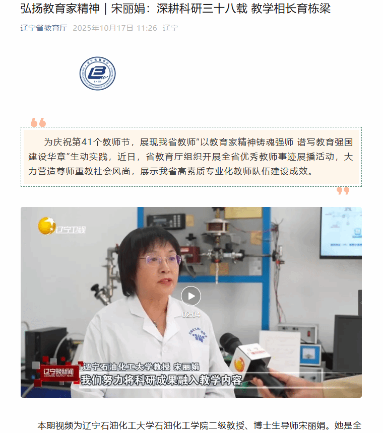 编者按:为庆祝第41个教师节,展现我省教师“以教育家精神铸魂强师 谱写教育强国建设华章”生动实践,近日,省教育厅组织开展全省优秀教师事迹展播活动,大力营造尊师重教社会风尚,展示我省高素质专业化教师队伍建设成效。10月17日,辽宁省教育厅微信公众号对我校石油化工学院二级教授、博士生导师宋丽娟的事迹进行了展播。现将相关报道转载如下: