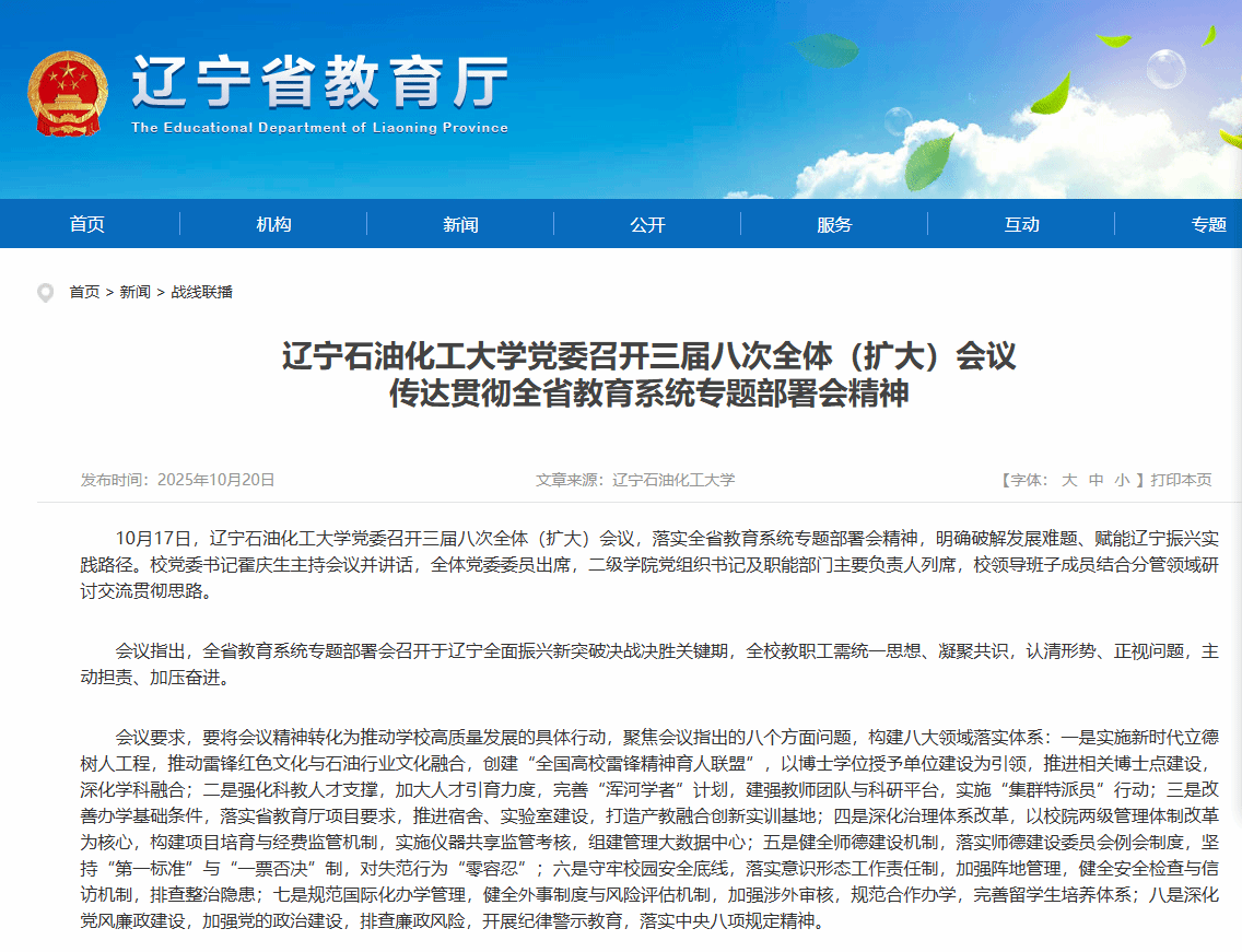 编者按:10月17日,辽宁石油化工大学党委召开三届八次全体(扩大)会议,落实全省教育系统专题部署会精神,明确破解发展难题、赋能辽宁振兴实践路径。辽宁省教育厅官网对此进行了宣传报道。现将相关报道转载如下: