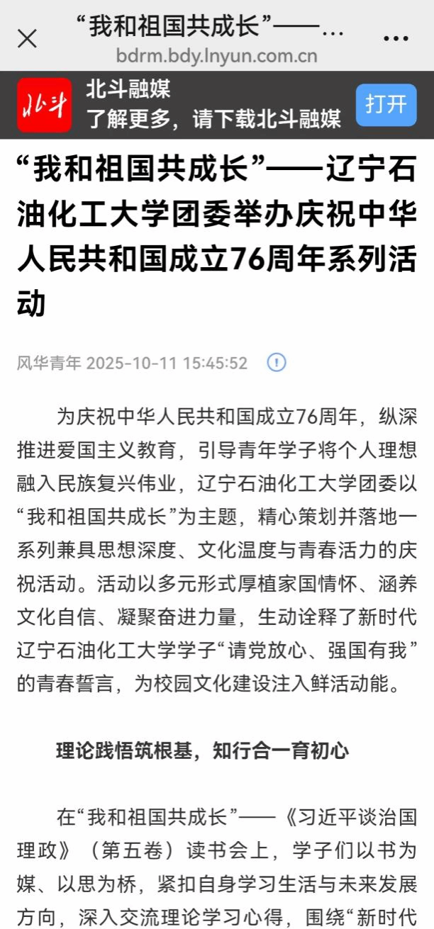 编者按:为纵深推进爱国主义教育,引导青年学子将个人理想融入民族复兴伟业,辽宁石油化工大学团委以“我和祖国共成长”为主题,精心策划并落地一系列兼具思想深度、文化温度与青春活力的庆祝活动。活动以多元形式厚植家国情怀、涵养文化自信、凝聚奋进力量,生动诠释了新时代辽宁石油化工大学学子“请党放心、强国有我”的青春誓言,为校园文化建设注入鲜活动能。让爱国主义教育从课堂延伸到实践,在行走中感悟初心使命,在共鸣中增强文化认同与民族自豪感。北斗融媒对此进行了宣传报道。现将相关报道转载如下: