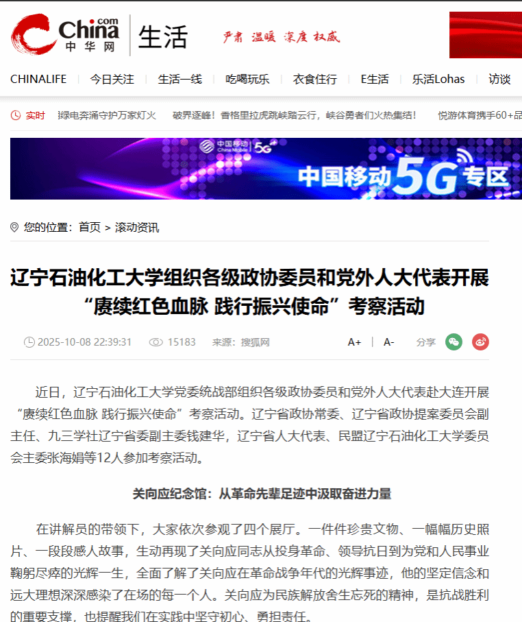 编者按:近日,中华网对我校党委统战部李新仓撰写的文章《辽宁石油化工大学组织各级政协委员和党外人大代表开展“赓续红色血脉 践行振兴使命”考察活动》进行了宣传报道。现将相关报道转载如下: