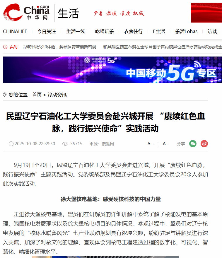 编者按:近日,中华网对我校民盟主委张海娟撰写的文章《民盟辽宁石油化工大学委员会赴兴城开展“赓续红色血脉,践行振兴使命”实践活动》进行了宣传报道。现将相关报道转载如下: