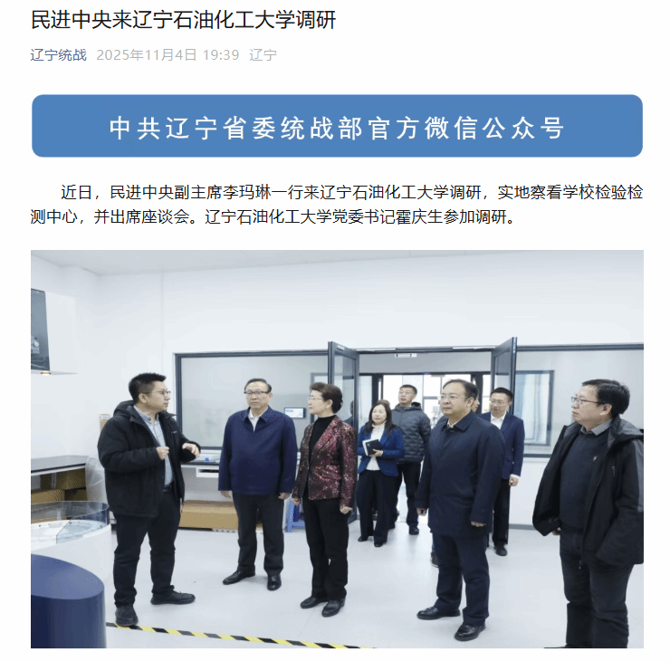 编者按:近日,民进中央副主席李玛琳一行来辽宁石油化工大学调研,实地察看学校检验检测中心,并出席座谈会。辽宁统战微信公众号对此进行了宣传报道。现将相关报道转载如下: