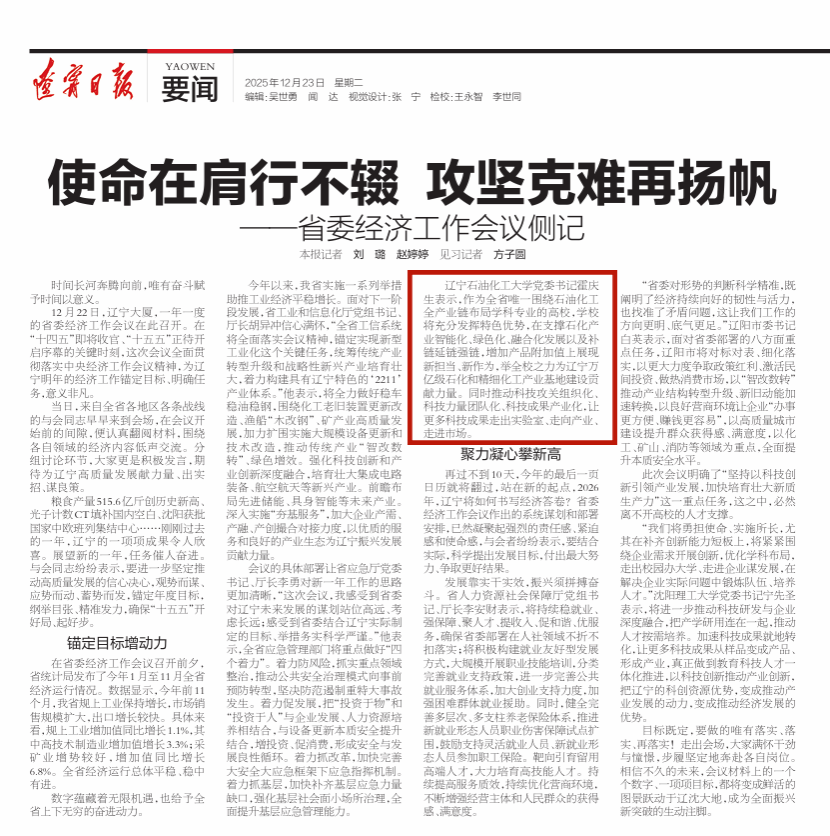 未来,辽宁石油化工大学将以省委经济工作会议精神为指引,牢牢把握高质量发展首要任务,充分发挥学科专业优势,深化改革创新,激发内生动力,为辽宁打造营商环境最佳口碑省、推动新时代东北全面振兴取得新突破,奋力谱写中国式现代化辽宁篇章贡献高校智慧和力量。(撰稿人:吕途 校对人:黄璜 审稿人:雷冬海)