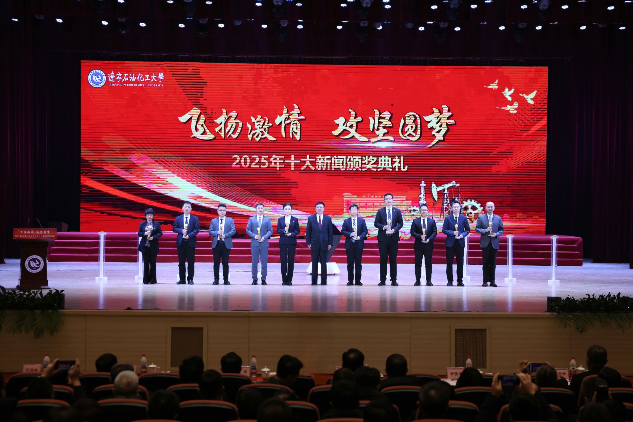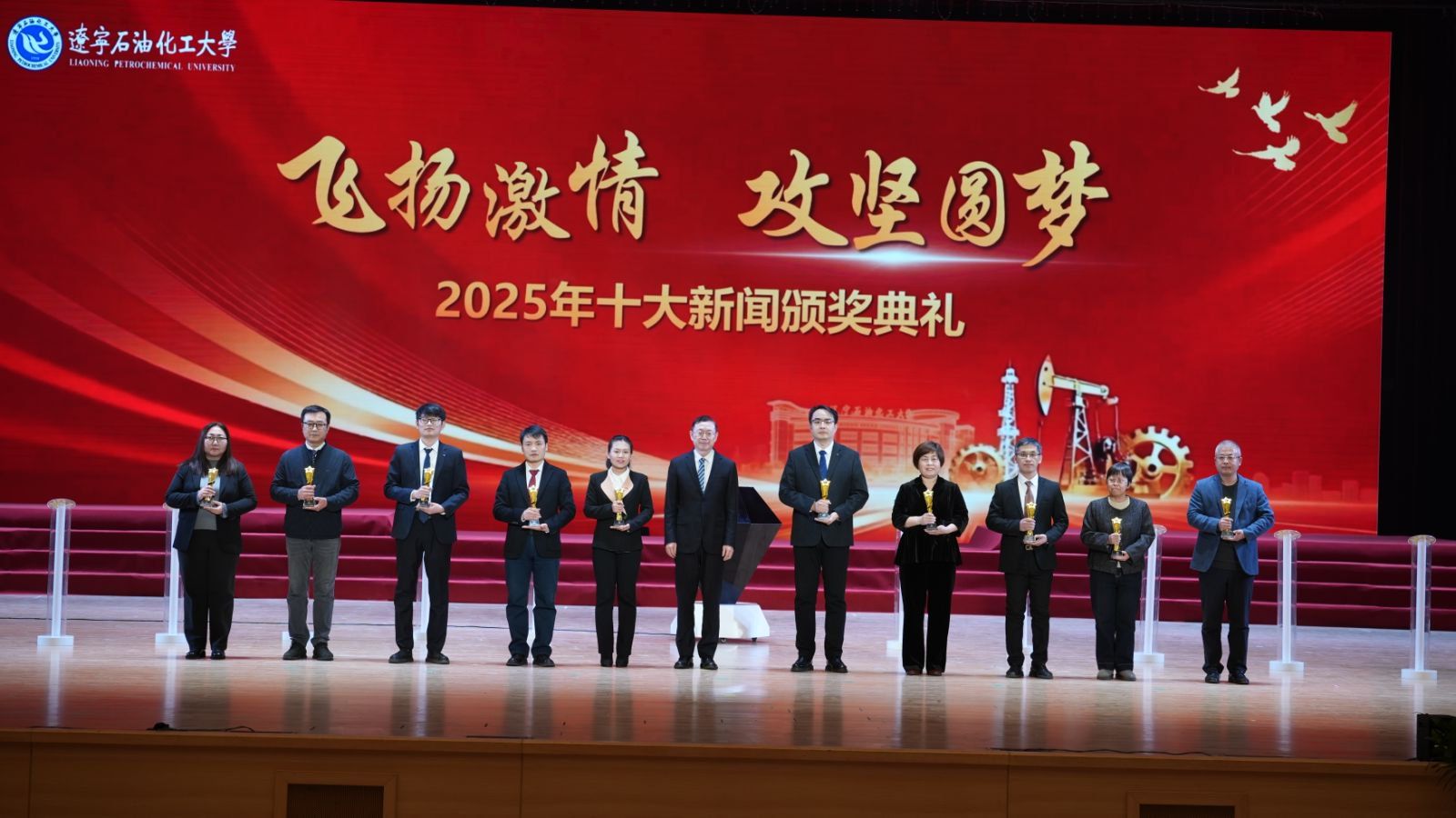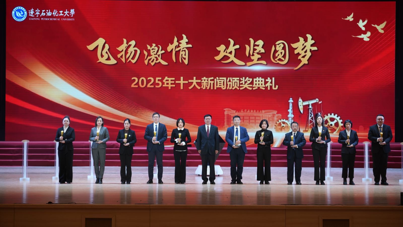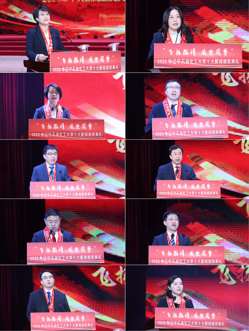 颁奖典礼现场,臻耀钻石与挺拔星柱的匠心陈设,致敬着辽石化大2025年的铿锵足迹。十位新闻推荐官倾情推介,讲述着背后的奋斗故事。校领导依次登台,为获奖集体与个人颁奖,表彰他们以踔厉奋发之姿助力学校跃升发展的亮眼实绩。