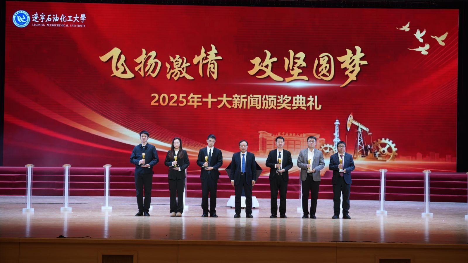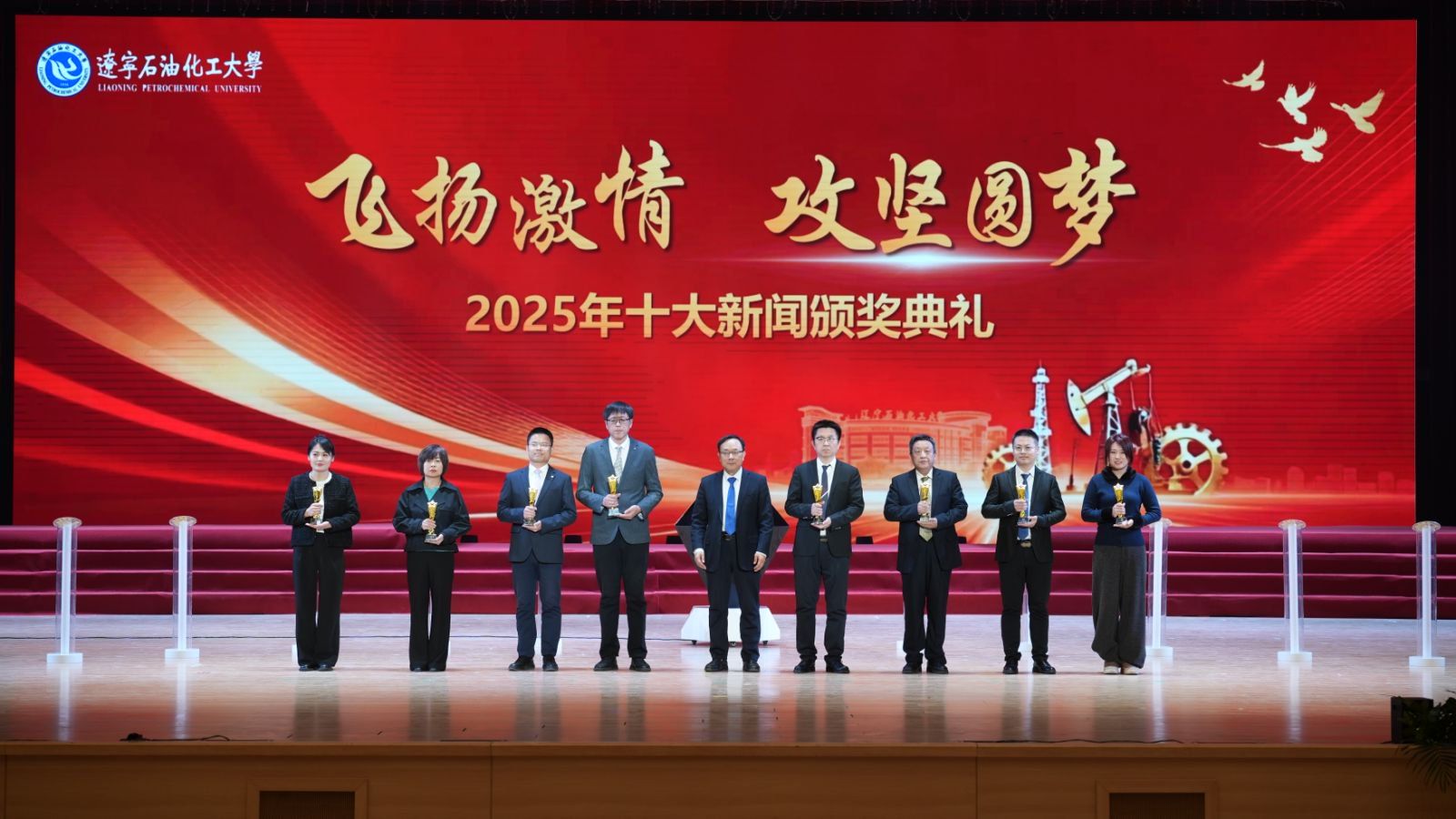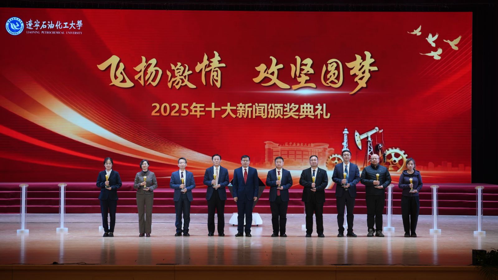 颁奖典礼现场,臻耀钻石与挺拔星柱的匠心陈设,致敬着辽石化大2025年的铿锵足迹。十位新闻推荐官倾情推介,讲述着背后的奋斗故事。校领导依次登台,为获奖集体与个人颁奖,表彰他们以踔厉奋发之姿助力学校跃升发展的亮眼实绩。