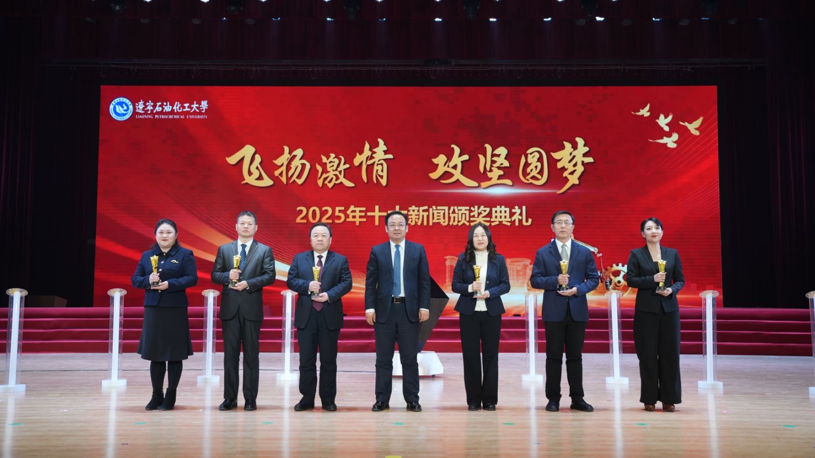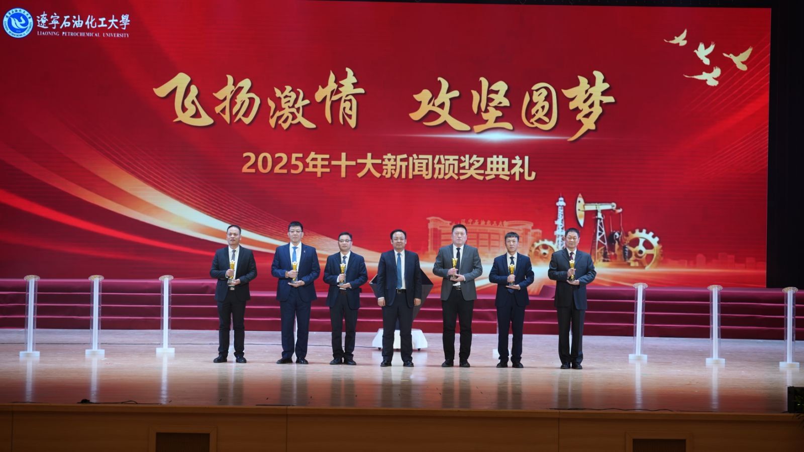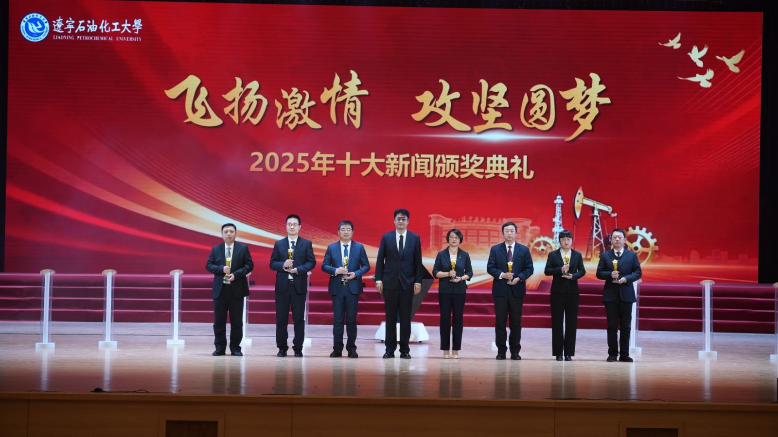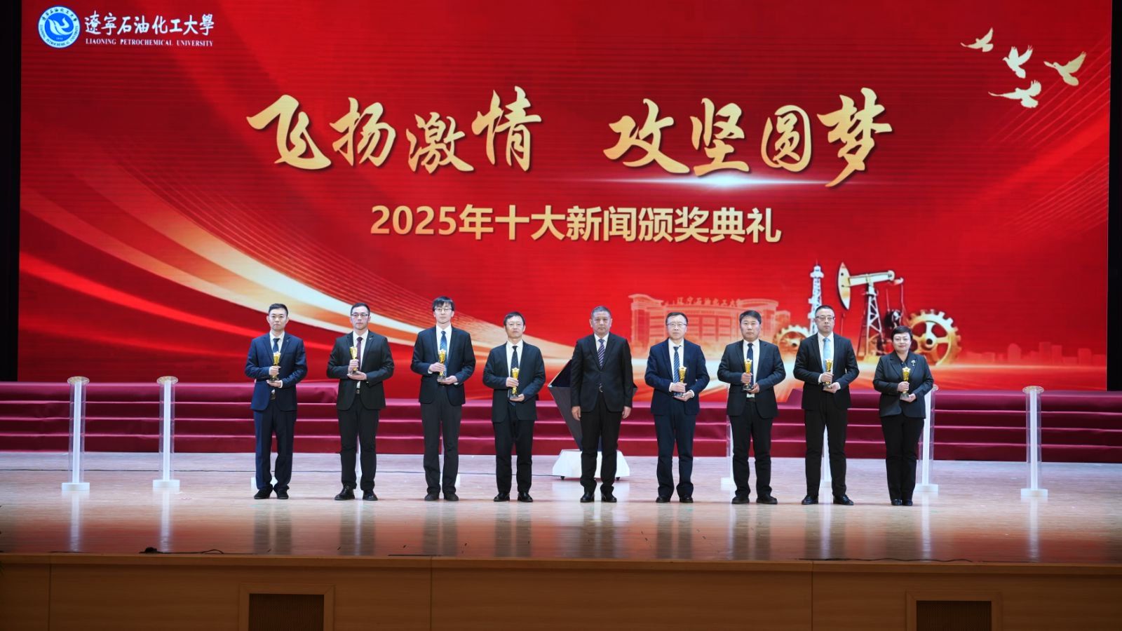 颁奖典礼现场,臻耀钻石与挺拔星柱的匠心陈设,致敬着辽石化大2025年的铿锵足迹。十位新闻推荐官倾情推介,讲述着背后的奋斗故事。校领导依次登台,为获奖集体与个人颁奖,表彰他们以踔厉奋发之姿助力学校跃升发展的亮眼实绩。
