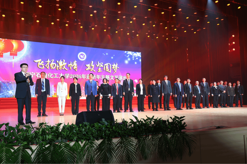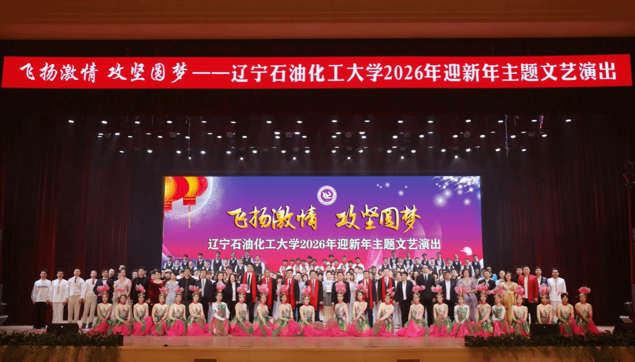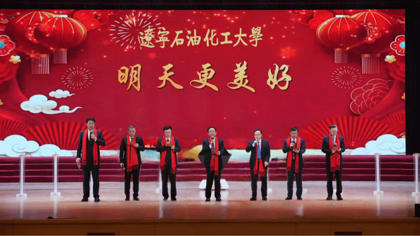 典礼尾声,全体校领导登台与全校师生员工共赴新春之约、共绘发展蓝图,致以诚挚新年祝福。祝愿伟大的祖国繁荣昌盛、国泰民安!祝愿共同的家园——辽宁石油化工大学,攻坚必胜、未来可期!祝愿全体师生员工,身体健康、万事胜意!